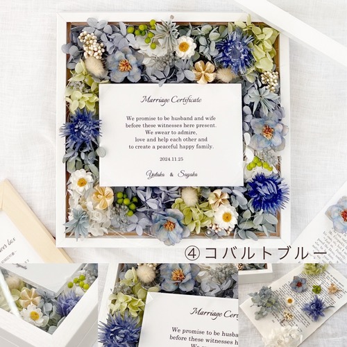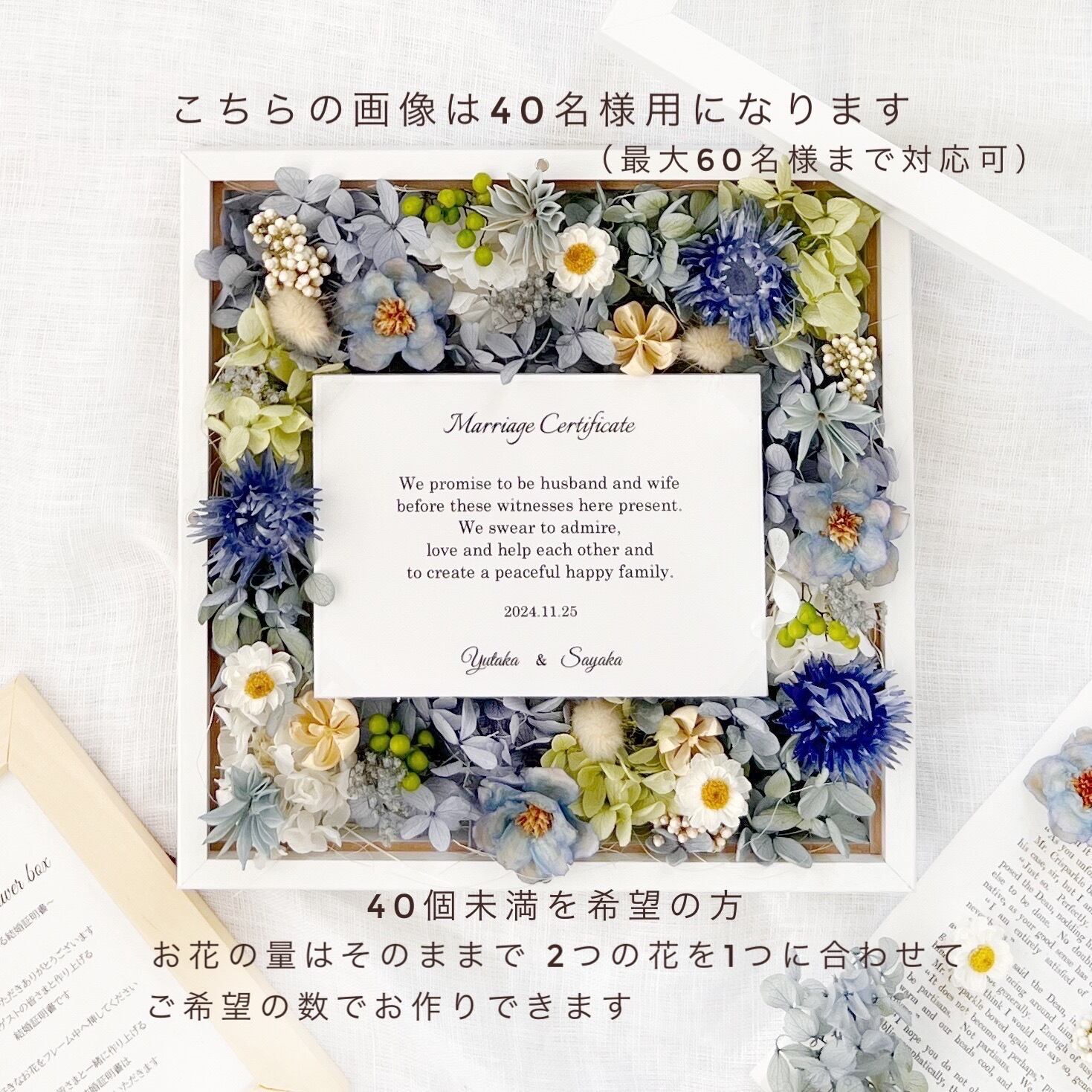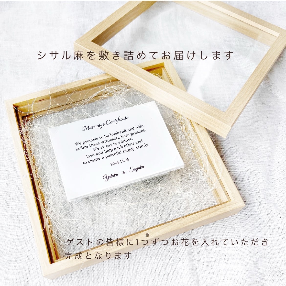 フレームにはシサル麻を敷き詰め、多種類の小花を1輪ずつご用意致しました。ゲストの方にフレームへ1つずつ入れて頂き世界にたった一つの素敵な結婚証明書ができあがります