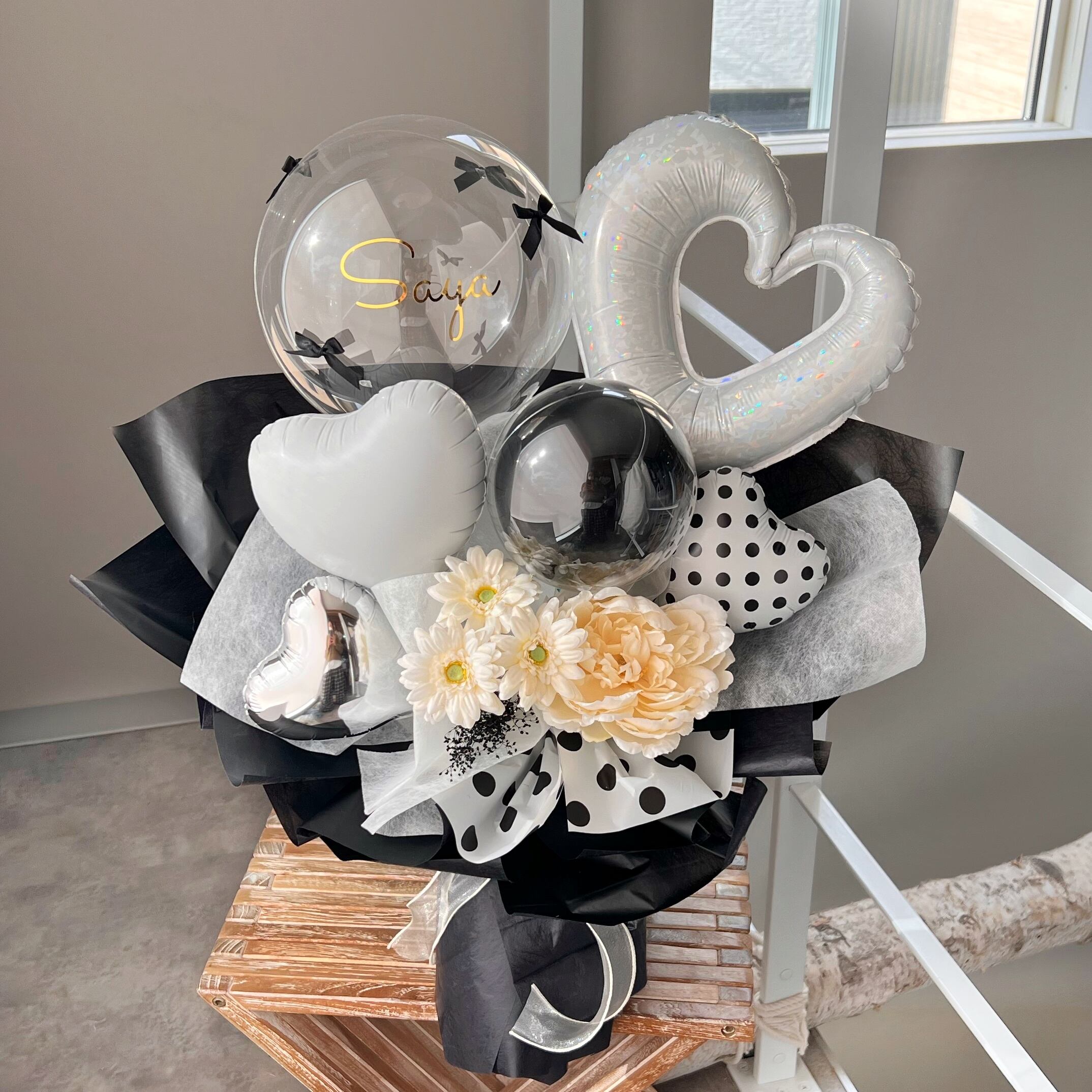 透き通った透明感のある特殊なバルーンをお入れした手持ちタイプの花束になります