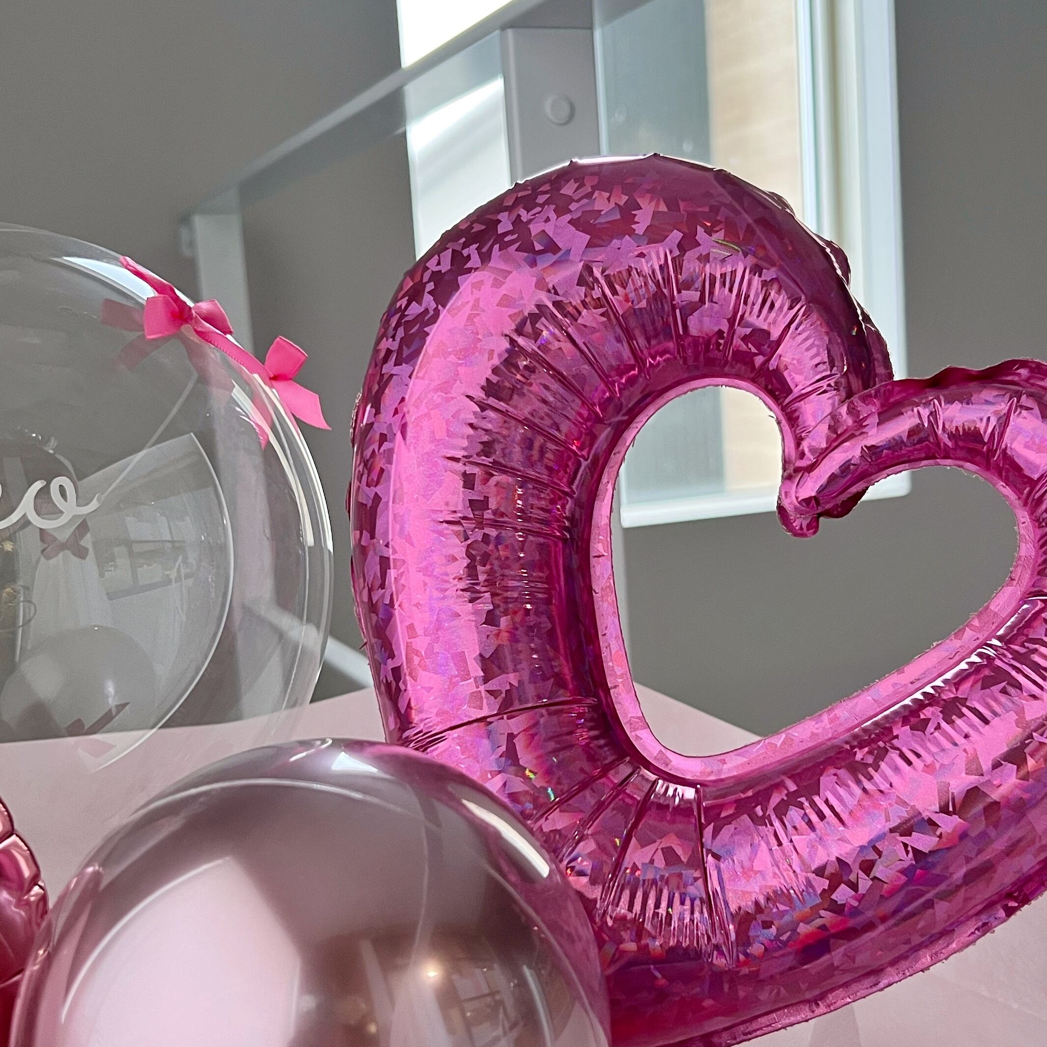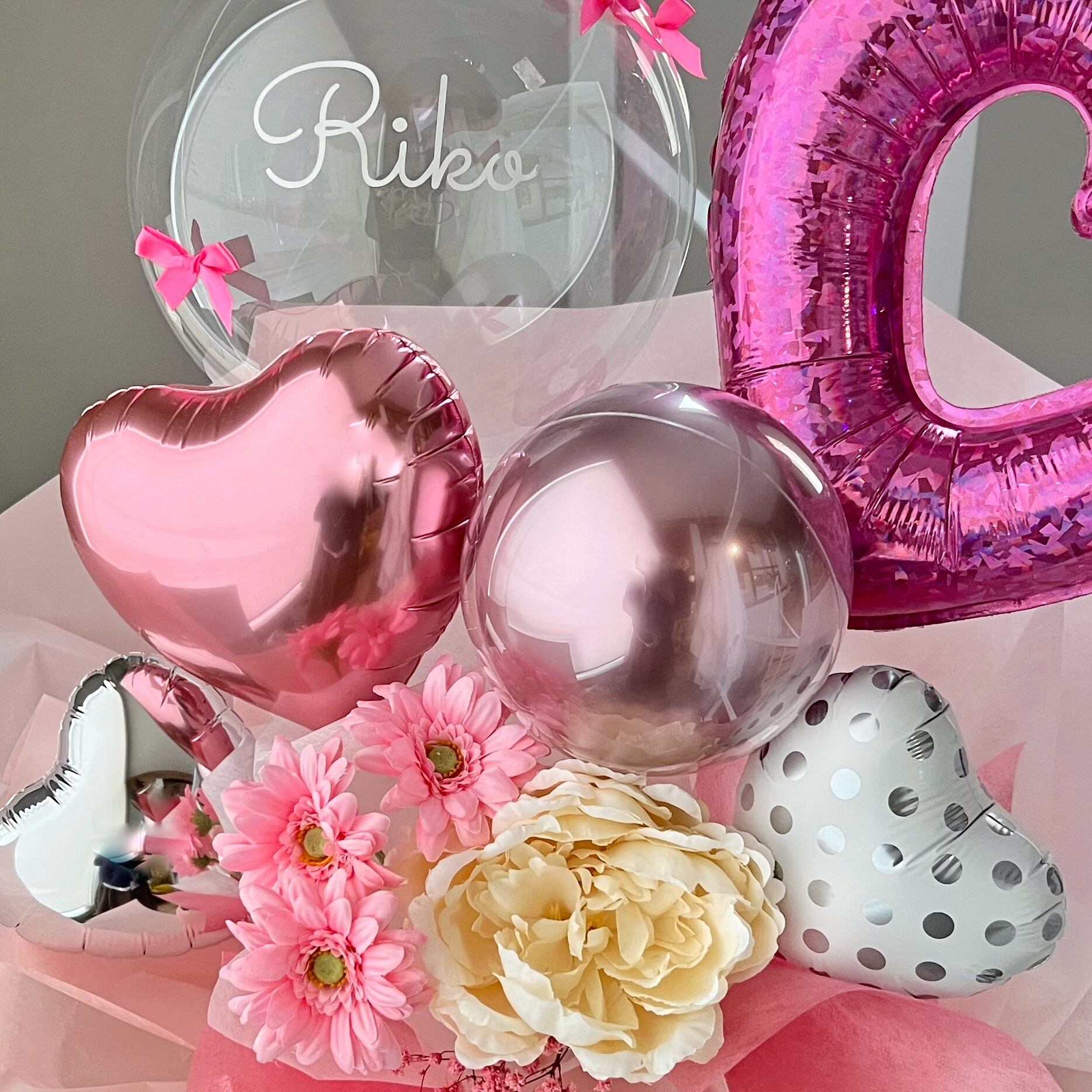 透き通った透明感のある特殊なバルーンをお入れした手持ちタイプの花束になります