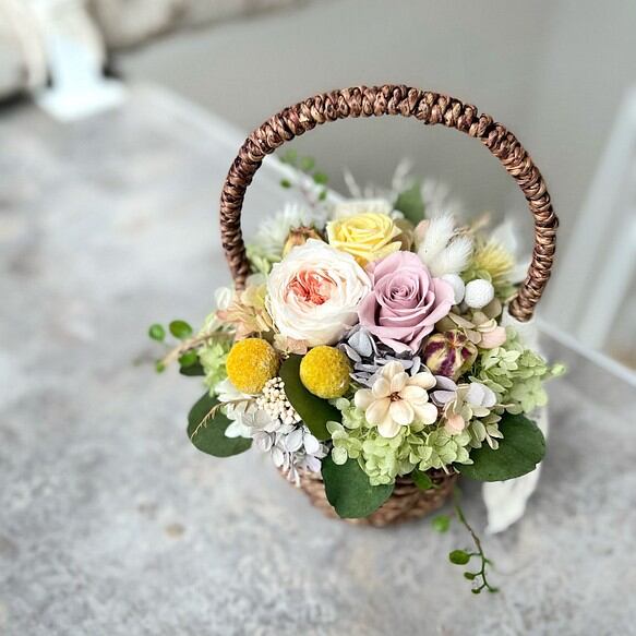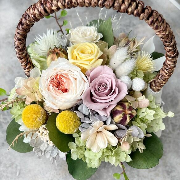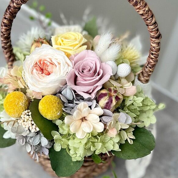 柔らかいくすみカラー色の小花をぎゅっと詰め込んだバスケットアレンジメントになります。バスケットいっぱいに咲かせた多種類の小花をお楽しみ頂けます