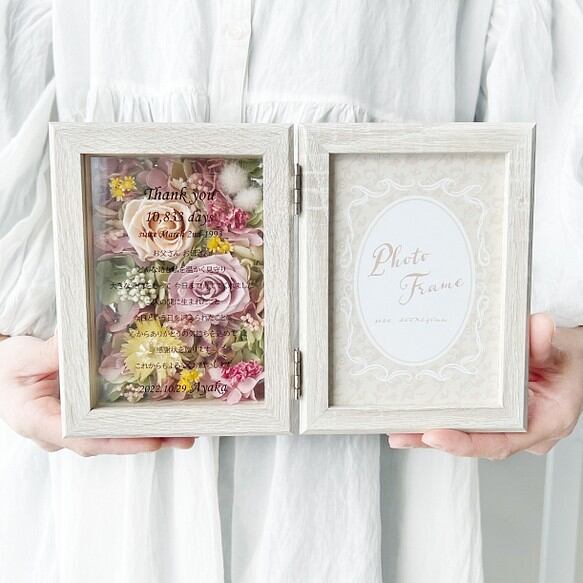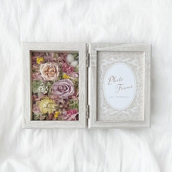 プリザーブドフラワーローズとアジサイ等を使用し、フレームは木目を生かしたナチュラルホワイト色、フレーム縁は角がないよう面取り処理した高級感のあるフォトフレーム(置き型)になります