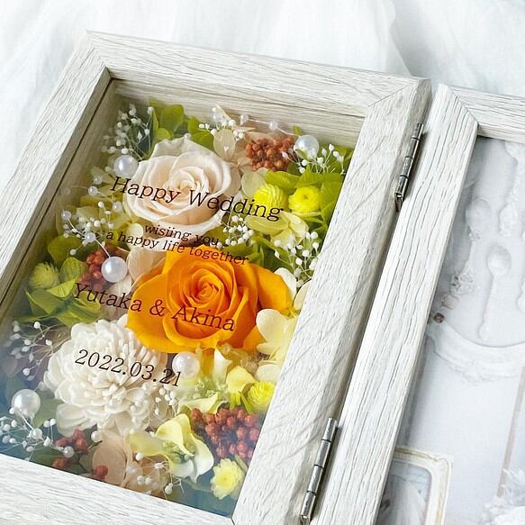プリザーブドフラワーローズとアジサイ等を使用し、フレームは木目を生かしたナチュラルホワイト色、フレーム縁は角がないよう面取り処理した(画像7枚目)高級感のあるフォトフレーム(置き型)になります