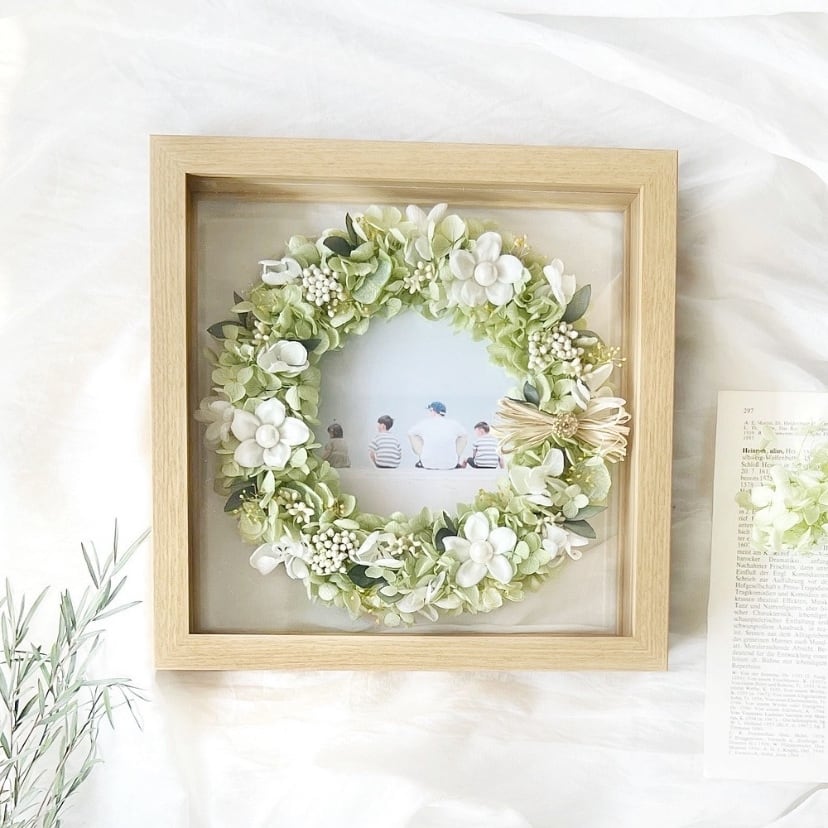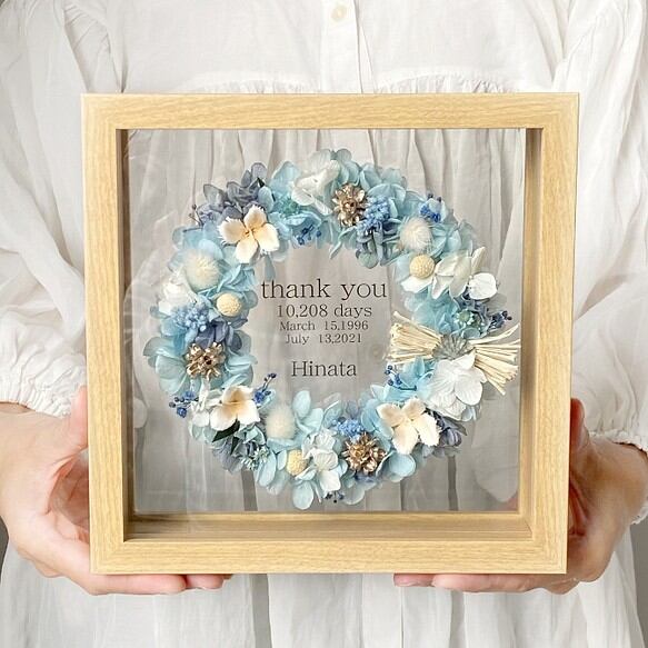 写真も飾れる*全30種類 木製ガラスフレームリース 708ベビーブルー ドライフラワー 両親贈呈 ウェディング 子育て感謝状