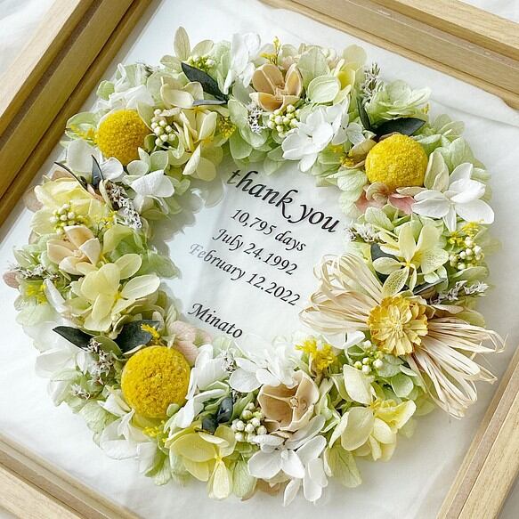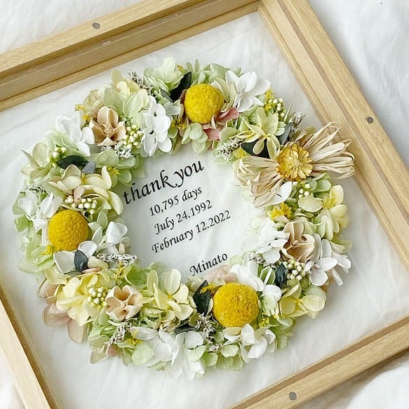 写真も飾れる*全30種類 木製ガラスフレームリース 715ビリーボタン ドライフラワー 両親贈呈 ウェディング 子育て感謝状 結婚式