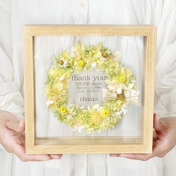 写真も飾れる*全30種類 木製ガラスフレームリース 716レモンピーチ プリザーブドフラワー ドライフラワー 両親贈呈 子育て感謝状