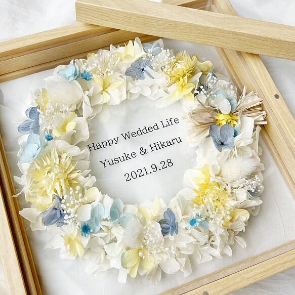 写真も飾れる*全30種類 木製ガラスフレームリース 727ホワイトイエロー ドライフラワー 両親贈呈 ウェディング 子育て感謝状 結婚式