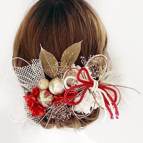 成人式、ウェディングドレス、カラードレス、袴、振袖、和装、白無垢、浴衣など様々なお衣装にとても合わせやすい髪飾りになります