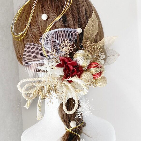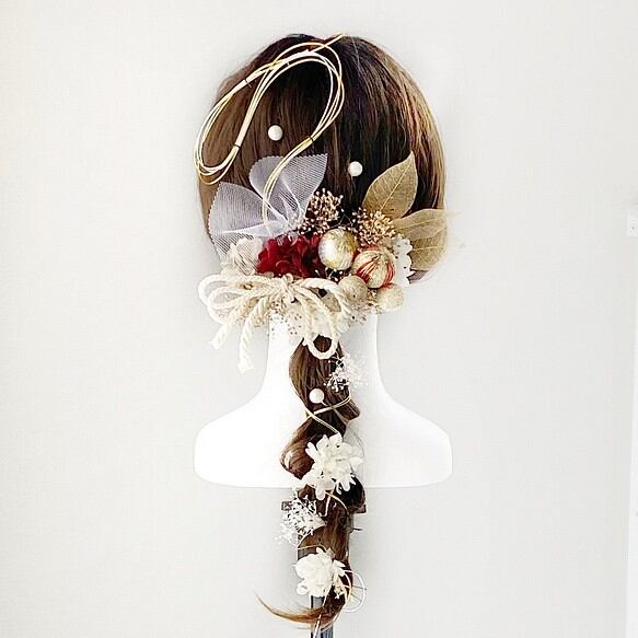 成人式、ウェディングドレス、カラードレス、袴、振袖、和装、白無垢、浴衣など様々なお衣装にとても合わせやすい髪飾りになります