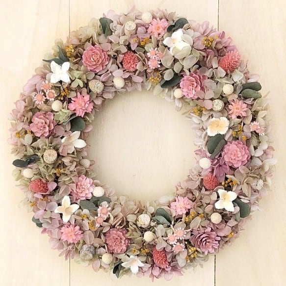 くすみピンク色の木の実や小花などドライ&プリザーブドフラワーを使用。少しくすんだお色やナチュラルな雰囲気がお好きな方にオススメのリースです。