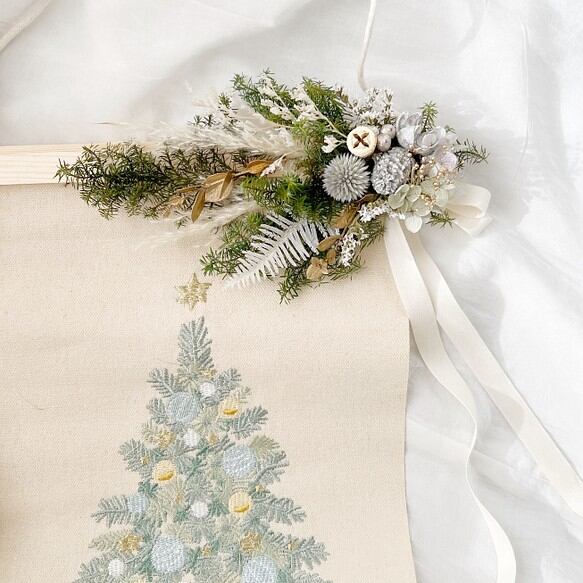 コットン生地にクリスマスツリーが刺繍されたナチュラルな雰囲気