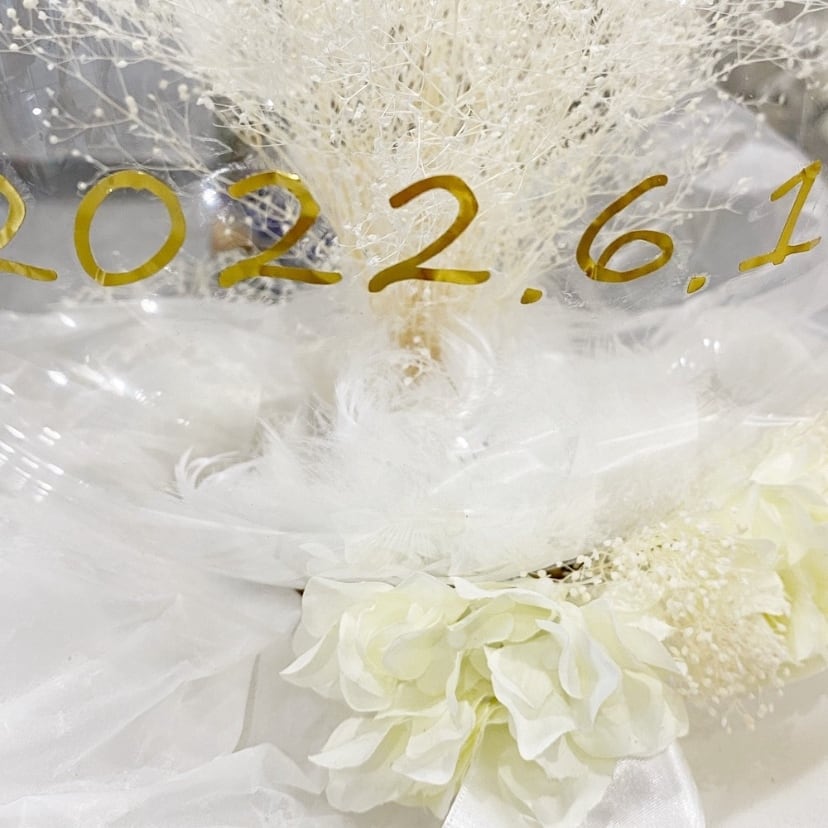 ドライフラワーでお作りしたブーケをアクアバルーンの中にお入れ致しました。白い丸ボックスに、かすみ草&アーティシャルフラワーでアレンジした置き型のタイプになります。