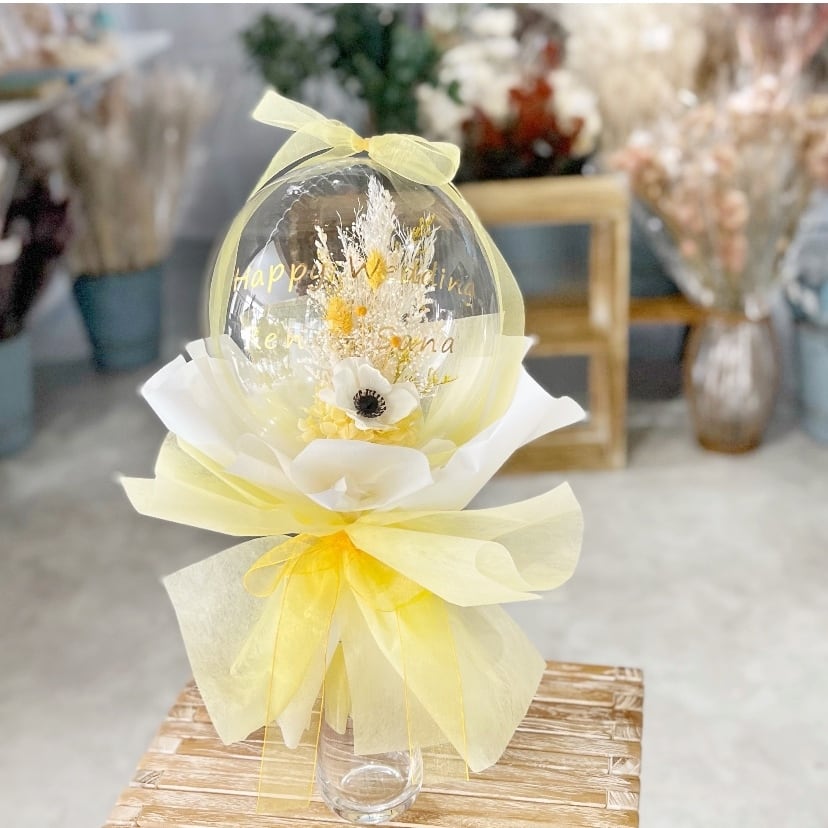ドライフラワーでお作りしたブーケをアクアバルーンの中にお入れ致しました